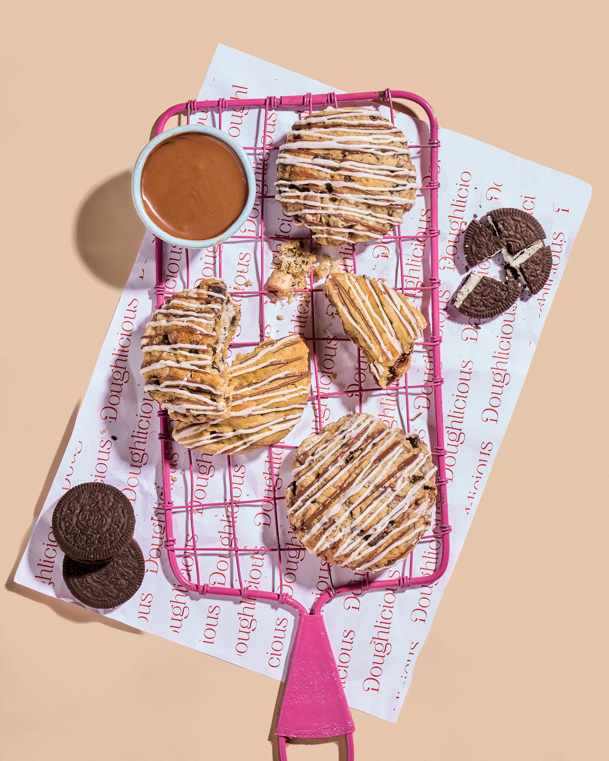 A classic flavor with a Doughlicious twist. Soft, buttery dough packed with crushed chocolate cookies and swirls of creamy white chocolate. Every bite is rich, crunchy, and melt-in-your-mouth smooth — the perfect balance of cookies and cream in cookie form.